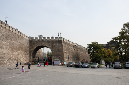 かつての北京の中心部を囲む城壁、門は大部分が撤去されていますが、残された数少ないものの一つが東南角樓です。現在の北京駅の南東に位置し、同駅を発着する列車の絶好の撮影ポイントとしても知られる場所ですが、ここに環城鐵路の遺構があります。現在、東南角樓の入場券売り場と入口は、下の写真のように城壁に対して斜めに穿たれたトンネルになっています。門が無く無防備、しかも斜めのトンネルは城壁に不似合いの不思議な姿です。