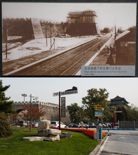 実はこのトンネルは、京奉鐵路から分岐した環城鐵路を通すために開けられたものなのです。東南角樓の南側、東便門站の古い写真を見ると、この斜めのトンネルとその中に線路が敷かれていることが判ります。次の比較写真をご覧ください。