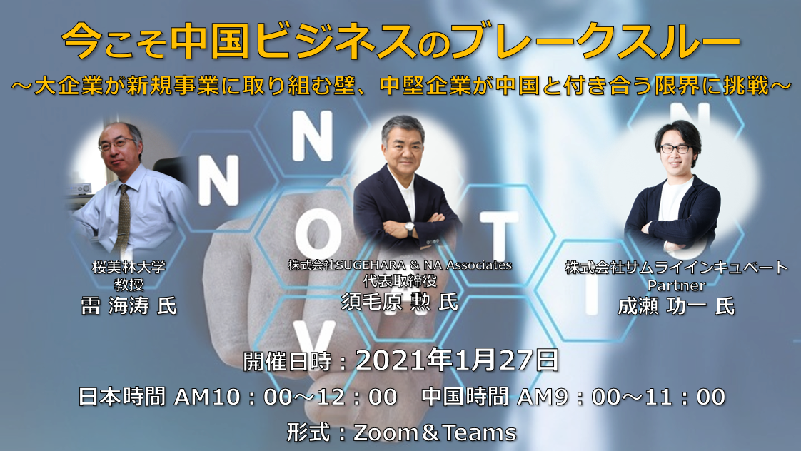 【セミナー】今こそ中国ビジネスのブレークスルー ~大企業が新規事業に取り組む壁、中堅企業が中国と付き合う限界に挑戦~(2021/1/27)