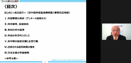 先日、鯖江商工会議所国際化委員会の会員と北陸銀行の取引先から約40名が出席され、2部構成で、セミナーが開催されました。第1部は「最近の米中情勢と日本ビジネスの動向について」をテーマに当機構事務局長 岡が講演し、第2部はディスカッション形式で進められ、北陸銀行上海駐在事務所清水所長と大連駐在事務所田村所長に加え、それぞれ現地より多数が参加されました。