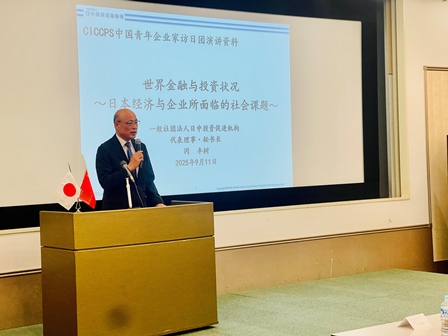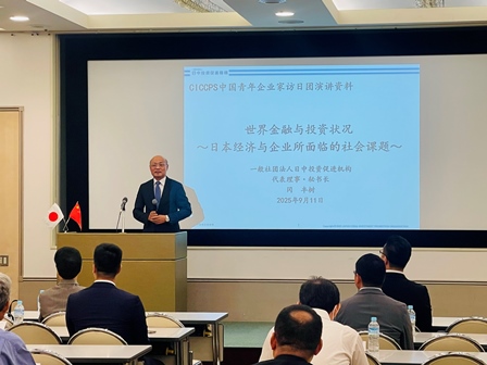 2025年9月11日(木)の午後に、岡事務局長が在日中国企業協会王会長からのご依頼を受け、中国御影経済国際合作商会(CICCPS)訪日団に「世界金融と投資の状況」について約1時間半の講演を行いました。岡事務局長から皆さまは関心が高い話題から、日中経済交流の現状・課題・改善策や日中関税の影響・継続可否や日本に投資なら可能な分野・口座開設などについて詳しくご説明しました。講演後は多くの参加者と懇親し、対日投資の戦略変化や課題認識などのお考えをお伺い、情報交換を通じ、相互意見をお聞きして、理解を深めていただきました。