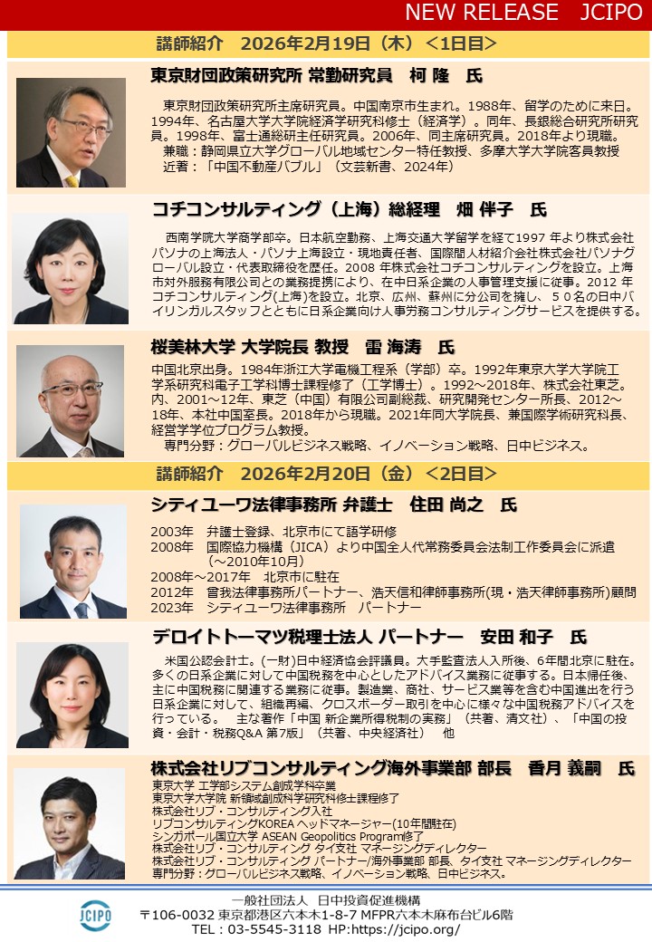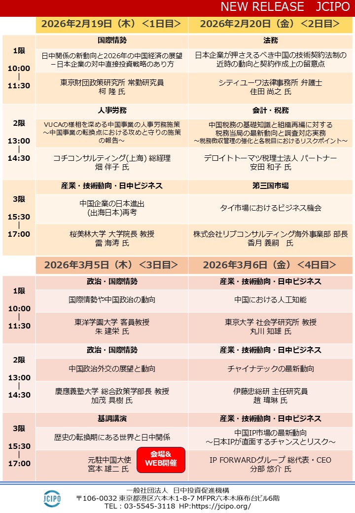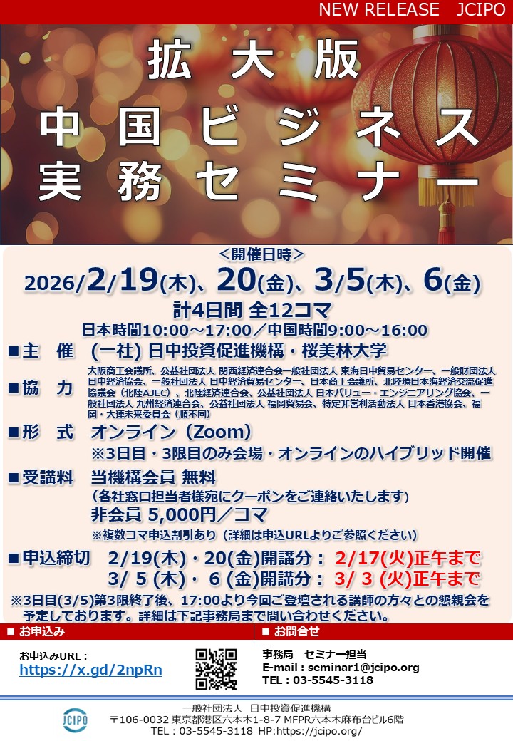 毎回ご好評をいただいております「中国ビジネス実務セミナー」を、2026年2月19日(木)、20日(金)、
