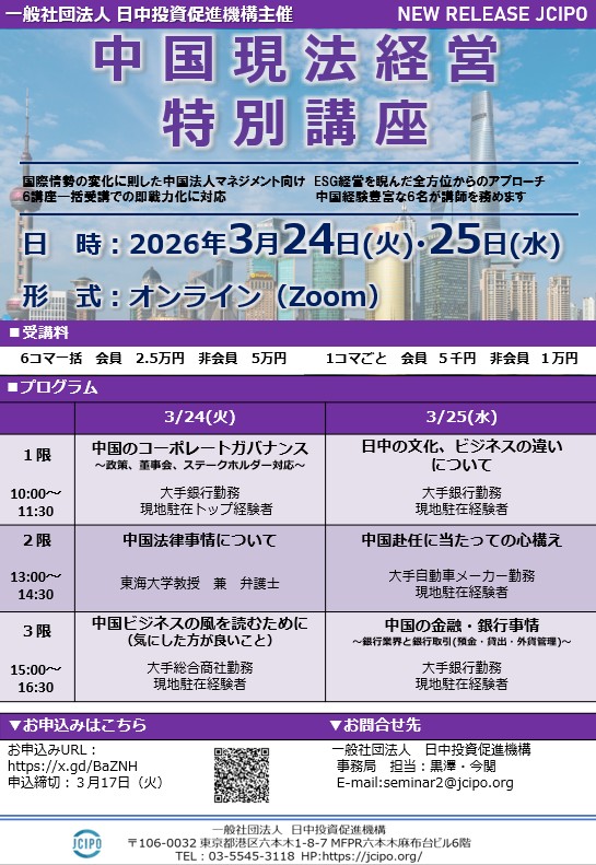 さて、当機構では中国経験が豊富な6名の機構職員が講師を務める「中国現法経営特別講座」を2026年3月に開講いたします。