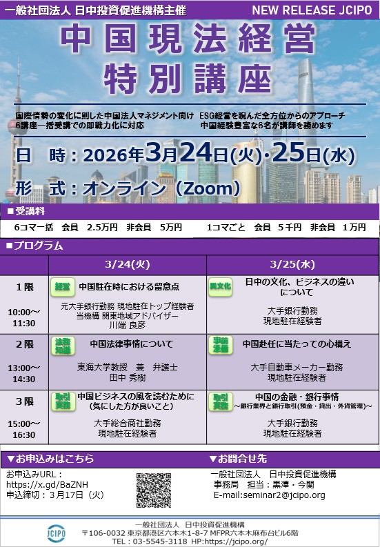 【ご案内】 中国現法経営特別講座(2026/3/24・25)