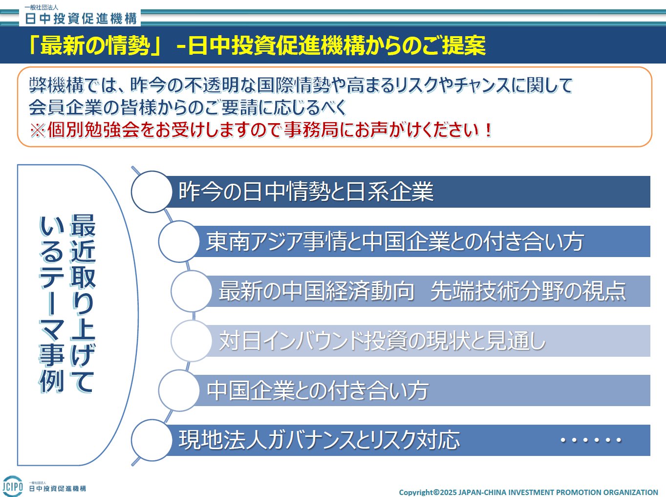 弊機構では、昨今の国際情勢・動向・リスクなどを踏まえるビジネスにおいては、会員企業の皆様からのご相談が増えています。会員企業のために、個別勉強会をお引き受けいたしますので事務局までお問い合わせください!