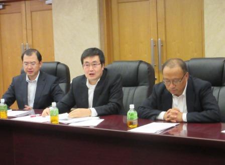(左より尹剛一等書記官、税制について説明する張小平一等書記官、劉亜軍公使)