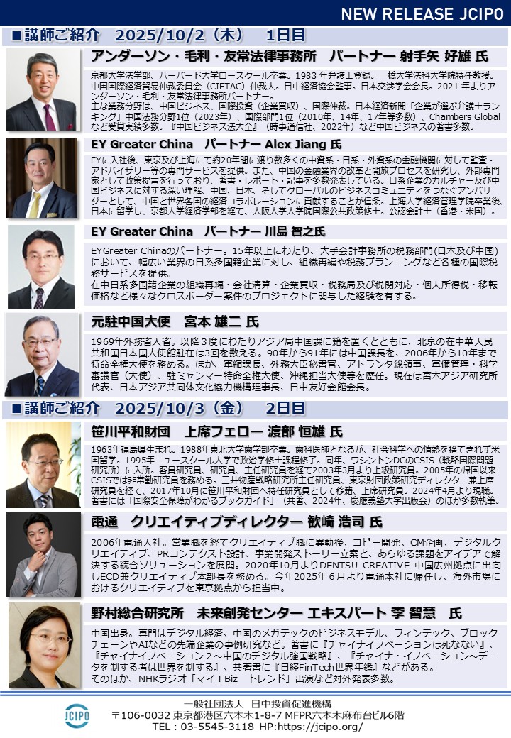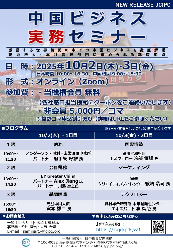 毎回ご好評いただいております「第40回中国ビジネス実務セミナー」を、2025年10月2日(木)、3日(金)にて開催いたします。