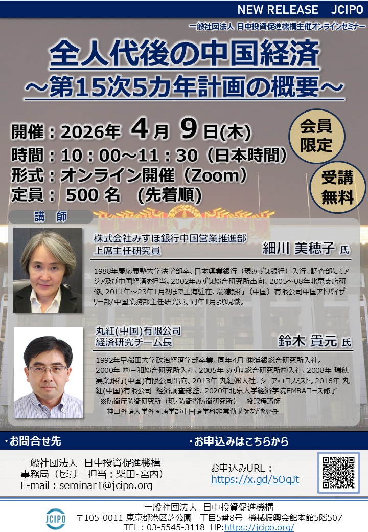 2026年度第1回目となる今回のオンラインセミナーでは、『全人代後の中国経済~第15次5か年計画の概要』と題し、全人代・第15次5か年計画の概要ならびに最新の中国経済の動向について、お二人のエコノミストにご講演いただきます。
