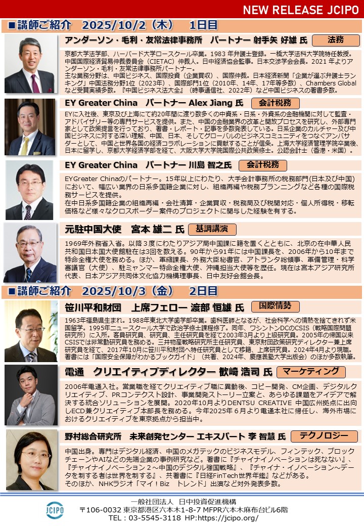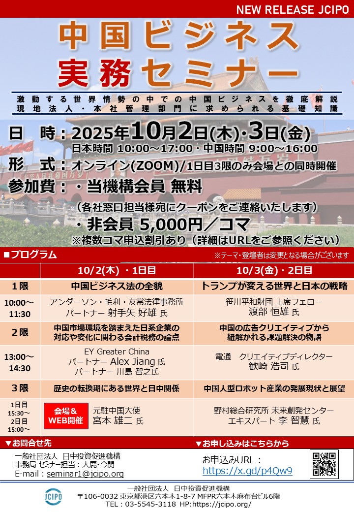 【終了】「第40回中国ビジネス実務セミナー」 (2025/10/2・3)