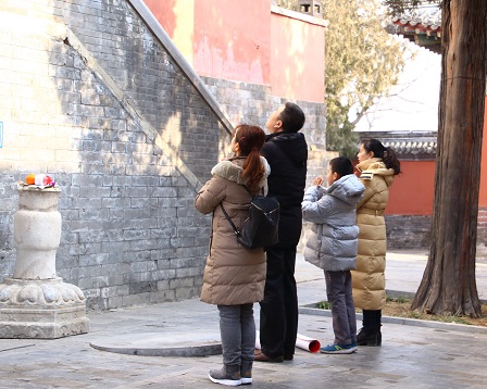 妙応寺では廟会(びょうかい)という春節の縁日のようなものはないため、沢山の人が押し寄せるということはありませんが、思ったよりも多くの人たちが来ています。人々は四ヵ所の仏殿を参拝したのち、白塔の周りを時計回りに何周も回ります。一人の女性は転経筒(てんけいとう)というチベット仏教徒がよく使う筒を右手に持ち、左手には数珠を握りながら回っています。回るということは、仏教の代表的な教えの一つで有る輪廻転生(りんねてんしょう)を表していると思います。