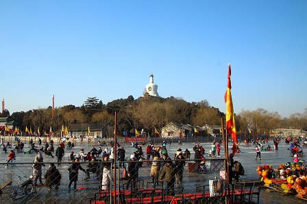 北京には万里の長城、故宮博物院、天壇、頤和園など世界遺産をはじめ数多くの名所旧跡があります。北京の人たちにとって、それらは誇れるものではありますが、世界的な名声があるがゆえに少しばかりよそよそしいものでもあります。それに反して、北海白塔は昔から変わらずに彼らの心の拠り所なのです。聞くところでは、文化大革命の際、猛威をふるった紅衛兵たちでさえ、北海白塔には指一本触れなかったそうです。それは、幼いときから四季を通じていつもその前で遊び、いつも自分を温かく見守ってくれる北海白塔が母親のような存在であったためです。今でも北海白塔の優しい眼差しに包まれながら多くの人たちがスケートを楽しんでいます。