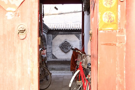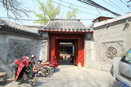 【花梗(かこう)胡同の四合院。両壁の彫刻が目を引く】