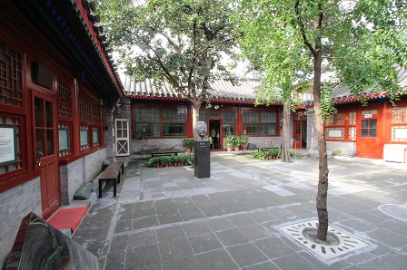 【老舎旧宅の内部。写真中央が主棟、右が東棟、左が西棟。手前の木がなつめ、奥の2本が柿の木】