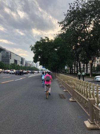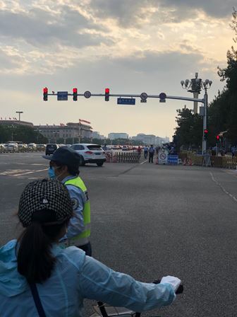 2.東長安街の様子です。コロナ肺炎の影響を受けて自転車で出退勤する人も増えています。全人代期間中は警備員も目立ちます。