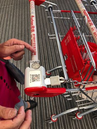 使用したショッピングカートを指定した場所に誘導する(人手を節約する)ため、事前に1元コインを投入して初めてカートを使えるようになり、使用後に指定した場所に返し、前方のカートと繋げた後に、投入した1元が戻ってきます。