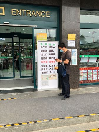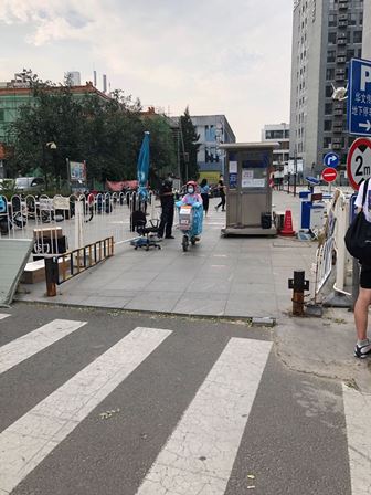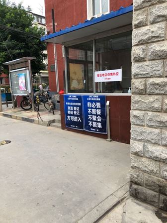 ある住宅団地の入り口です。体温検査、健康アプリの確認、出入り証明の確認が必要です。また、必要のない会食や集まりをしないように呼び掛けています。