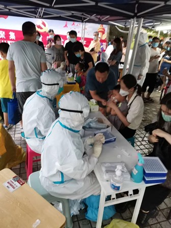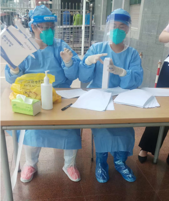 2、西城区(市内中心部)のある検査場の検査員です。30度以上の高温の中、頭の先から足の先まで保護服で覆われています。
