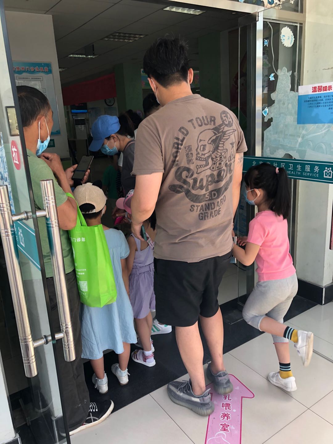 入り口で先ず事前に予約した子供の情報を確認します。体温検査も必要です。また、付き添いの親たちはスマホの北京健康宝アプリの健康情報を提示しなければなりません。