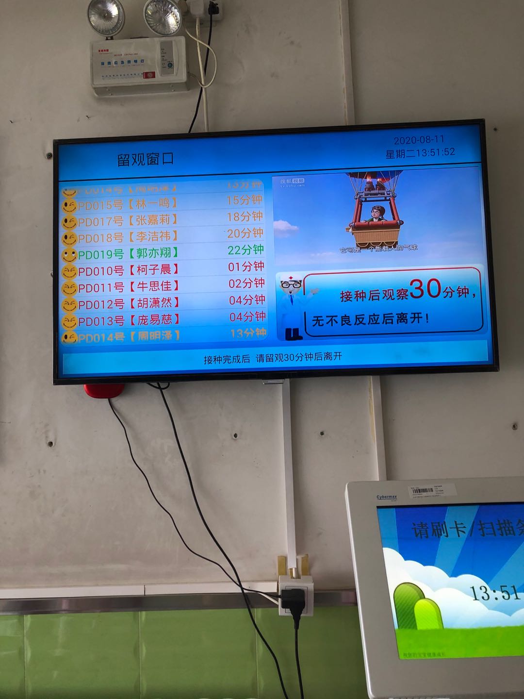 注射後、30分の観察期間があります(スクリーンにはそれぞれの残り時間が明示されています)。子供たちはアニメを見ながら待つことができます。30分後、不良反応が無ければ帰ることができます。