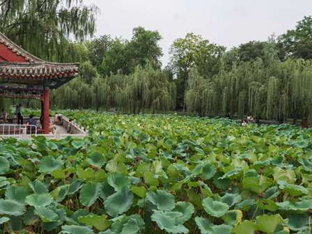 公園で蓮を鑑賞している人々の様子です。花と花托はもう枯れてしまい、葉っぱだけ鑑賞できます。詩に曰く「接天蓮葉無窮碧」(宋代・楊万里)、まさにそのような美しい風景です。