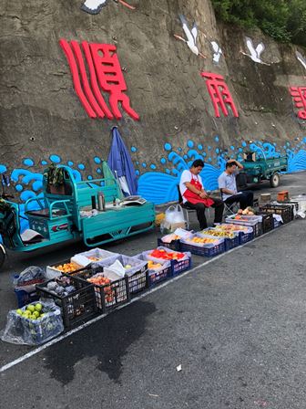行く途中で通過した山中の道端で特産物を販売している村の人たちです。果物や甘栗、卵などがあります。