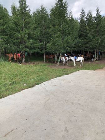 朝出発して、昼頃ホテルに着きました。青空と白雲が交じり合って、周辺はすべて草原で、とても綺麗です。