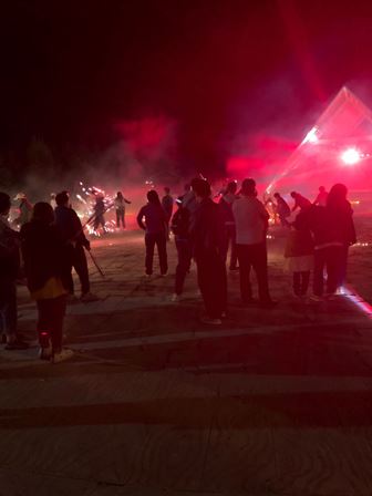 夜、ホテル側が花火大会を用意してくれました。草原では朝晩が冷えますので(気温11~21度)、夜はみなで厚着になりました。