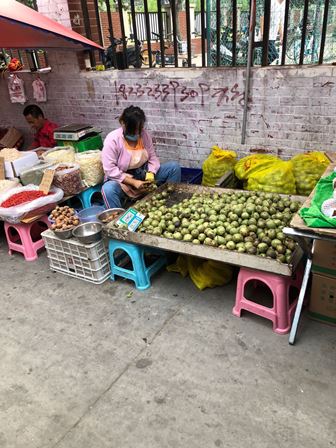 季節の果物、ナツメやブドウ等、山のように積まれています。ナツメは1kg、15元、リンゴとモモは1.5kg、10元、スーパーより安くて人気が高いです。