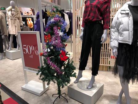 2階は主に婦人服の売り場で、現在は年末ですので大バーゲンをしています。洋服等は定価の1割から5割の値段で販売している商品が多いようです。以前に比べれば、来店客はだいぶ減少し、このようなデパートの経営はかなり大変のようです。コロナのせいもあり、ネット販売の急成長も原因の一つでしょう。クリスマスツリーを飾っている店も多いです。