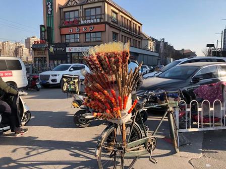 デパートで洋服等を買って、外に出たところ、自転車で「糖葫芦」を売っているおじいちゃんに出会いました。子供たちに山楂子の「糖葫芦」(中にもち米が入っている)をそれぞれ1本買ってあげました。山楂子と長芋、黒棗は1本8元で、ミカンやイチゴは1本10元です。「糖葫芦」を食べながら子供たちと歩いて家に戻りました。