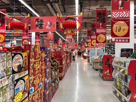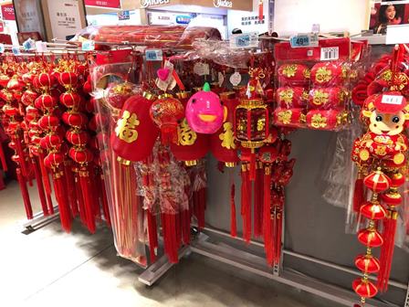 スーパーはまさに「春節」の雰囲気で、赤の灯篭で飾ったり、「恭賀新」、「牛年大吉」、「属你最牛」(あなたがNo1)等、牛と関係あるめでたいスローガンを掲げたりしています。