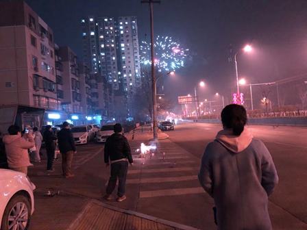 除夕の夜の爆竹と花火の様子です。大気汚染対策で、北京では5環路以内は鳴らすことは禁止ですが、自宅は5環路の外側ですので、夜6時から夜中1時あたりまでずっと鳴らしていました。