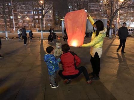 また、「孔明灯」(諸葛孔明が考案したと言われる紙製の熱気球)を打ち上げている人もいます。「孔明灯」は普通、「元宵節」又は「中秋節」の時に、家族の幸せを祈り打ち上げます。昔は竹と紙で作りましたが、今は殆どネットから購入し、竹と布でできているようです。