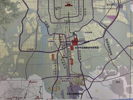 「北京市日中イノベーション協同モデル区」は天安門の南方向(約13㎞)に位置し、大興空港まで車で約20分、雄安(約100㎞)と天津(約140㎞)にも近く、交通上便利な立地となっています。将来、順義の北京首都空港と通州の北京市政府へ直接繋がる地下鉄も計画しています。