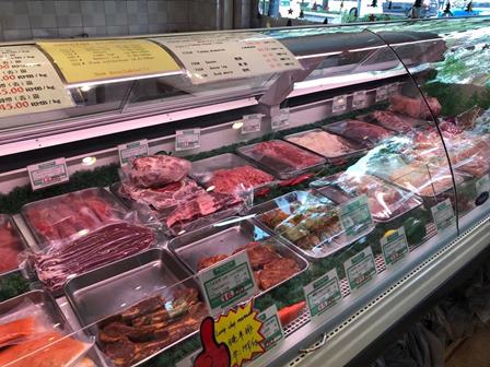 店に入って、先ず目に入ったのは様々な肉類です。値段は普通のスーパーより少し高いです。ここで今回のBBQに使う味付け(マリネ)の牛肉や羊肉、鶏肉等を見つけました。