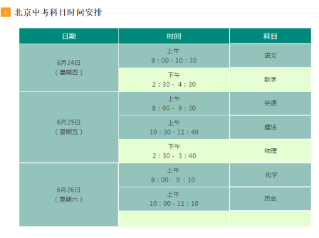 今年の北京市の「中考」のスケジュールは以下の通りです。試験科目には国語、数学、英語、道法(道徳与法治)、物理、化学、歴史が含まれています。