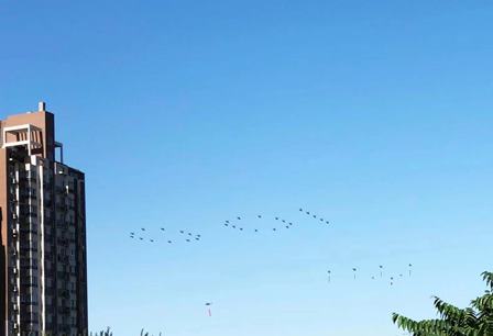6月に入って、数回祝賀行事のリハーサルを行ったようです。下図は6月19日(土)、自宅付近を通過するヘリコプターの隊列です。「100」という数字を描いて飛んでいました。