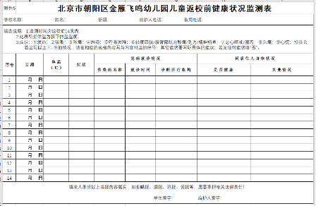 また、幼稚園入学前14日間の家族全員の体温や健康状況、北京を出ることがあるか否かの情報を記入し、学校に提出しなければなりません。異常がある場合、子供の通園は延期される可能性があります。