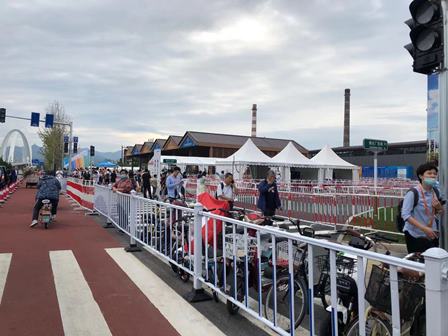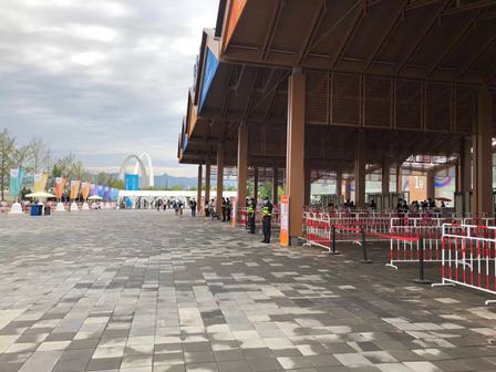 下図は首鋼園会場の入り口の様子です。コロナ対策で、入場客に対して体温の測定や北京健康宝アプリの確認等が要求されています。また、会議等重要なイベントに参加する場合、48時間以内のPCR検査陰性証明の提示も必要となります。