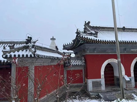「立冬」の前日から寒気で気温が低下し、最低気温は-4度まで下がり、前日の昼間は雨で、夜は雪に転じました。統計データによると、1961年以来、北京の平均初雪日は11月29日で、今度の初雪は例年より20日間早かったそうです。下図は初雪の中の白塔寺の様子です。