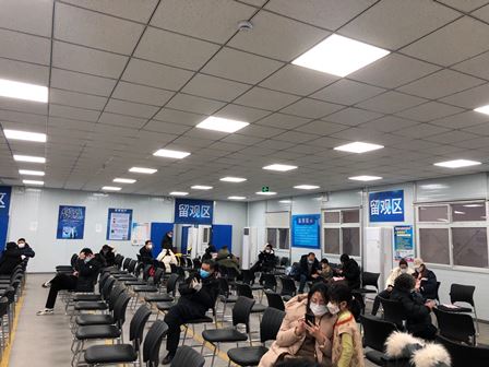 接種拠点の対応時間は8:30~11:30、13:30~17:00となっています。朝一で着いたので中は未だ人が少ないようです。この接種拠点で確認したところ、ここはこの周辺で唯一子供の接種ができる拠点だそうです。勿論、大人の接種もできます。現在、北京市においては大人のワクチン接種は「北京生物」と「科興」(メーカーの名前)のどちらを選んでもいいですが、3~11歳の児童には全部「北京生物」を使います。