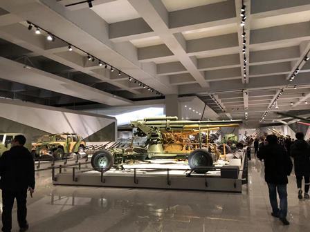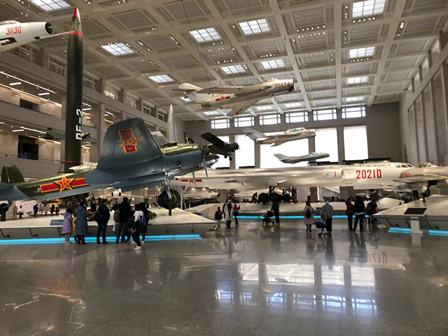 軍事博物館(正式名称は中国人民革命軍事博物館)の内部の様子です。天安門の西の長安街延長線上に位置し、陳列面積は6万㎡近くで中国初の総合軍事博物館です。館が所蔵する文化財には飛行機、大砲、艦船、ミサイル、銃器などが含まれています。実物のものが非常に多いので、子供の間では人気が高いです。身分証明書があり携帯を通じて事前に予約すれば、無料で入場できます。下図は実物の戦闘機や大砲等の展示ルームの様子です。