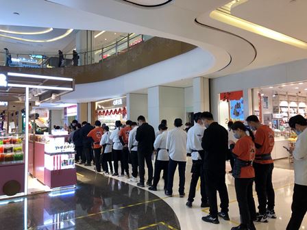 また、北京においてはコロナ対策は依然として厳しく、飲食店等の従業員は定期的にPCR検査を受けなければならないそうです。下図はあるデパート内の飲食店従業員がPCR検査を待っている行列です。関係者の話によると、ここの店は10日間おきにPCR検査を実施するようです。