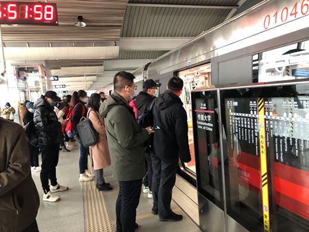 当日の夕方、出退勤でいつも利用している地下鉄「八通線」は雪の影響で故障してしまい、途中の「高碑店駅」で降ろされてしまいました。下図は「高碑店」駅構内で故障した列車の移出を待っている乗客の様子です。幸いなことに、約15分後には次の列車が来てくれて、いつもよりスピードはゆっくりでしたが無事自宅に帰れました。