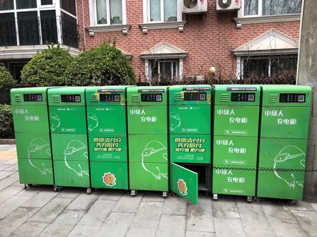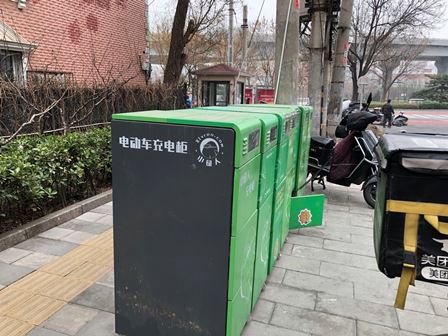 また、最近、北京市内の街頭では電気自動車向けの充電箱が良く見られるようになりました。下図は「小緑人充電箱」の様子です。貼りついているQRコードをスキャンし、携帯のWechat等経由で支払いすれば、「充電箱」が自動的に開き、その中のプラグを電気自動車に差し込めば充電できます。また、この「充電箱」は宅配ボックスとしても使えます。費用に関しては、電気代は0.4元/時間、荷物の保管料は0.2元/時間、夜はもっと安くて0.1元/時間です。計算してみると、電気自動車に一回充電するには3元もあれば十分です。デリバリー関係者や一般住民にとっては非常に便利です。