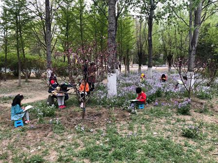 今は丁度、二月蘭(紫金草)の満開の時期で、北京市内の道端や住宅団地の中、各公園の中でその姿がよく見られます。下図は二月蘭をスケッチしている、ある塾の生徒さんの様子です。
