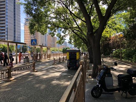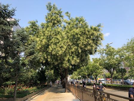 7月に入り、北京市の市の木の一つである「国槐」(中国原産なので、「国槐」と呼ぶ。黒槐とも言う)が花盛りに入りました。国槐は北京での栽培の歴史が非常に長く、元の時代から今まで、ずっと北京の街路樹の主要な種類です。不完全な統計によると、北京市内には現在50万本以上の「国槐」があります。下図は国貿周辺で撮影した「国槐」の様子です。満開の「国槐」の姿は詩情と絵心があるのですが、清掃労働者の仕事量を増やしています。電気清掃車も終日作業しているようです。