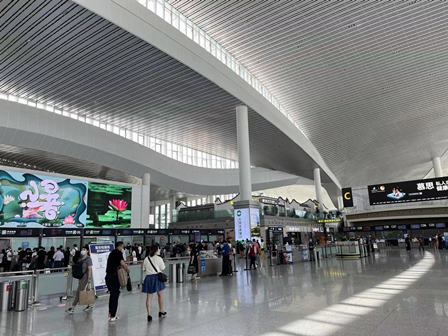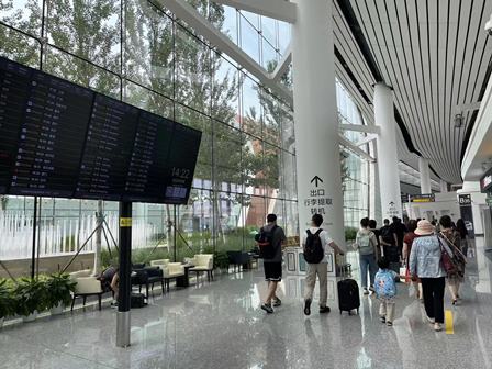 下図は出張の帰りに北京大興空港で撮影した写真です。中国の夏休みの到来と帰京政策の緩和に伴い、大興空港も久しぶりに賑やかな風景になりました。最近の大興空港の入出港旅客数は先週と比べると2倍近く増加しました。因みに、最近北京から飛行機で移動する場合、48時間以内のPCR検査陰性証明書と北京健康宝緑コードが必要です。