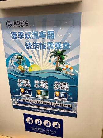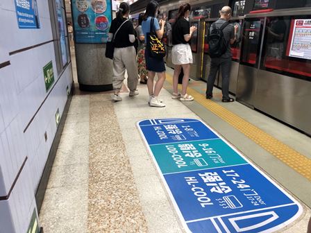 地下鉄においては、「強冷房」と「弱冷房」車両を区別し、床や車内に大きく表示しています。乗客が多いため、約2/3の車両は強冷房、1/3は弱冷房に設定されています。下図は地下鉄1号線の大望路駅で撮影した写真です。