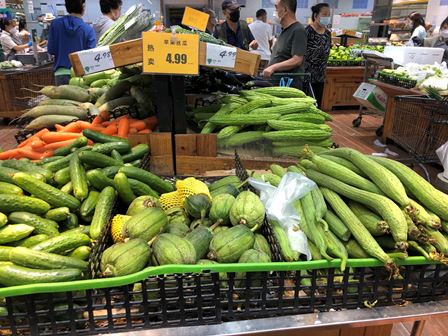 最近、例年より雨が多く、その影響を受けて野菜は減産し、価格が高騰しています。代表的な寿光野菜価格指数は既に4週連続で上昇しています。特に青菜類の上昇幅は大きく、例えば、500グラムで、ほうれん草は12元、レタスは6元まで上がっています。下図は自宅付近のスーパーで撮影した写真で、現在、500グラムあたり茄子は5元、キャベツは3.5元、トマトは4元、冬瓜は3元、胡瓜は5元となっています。